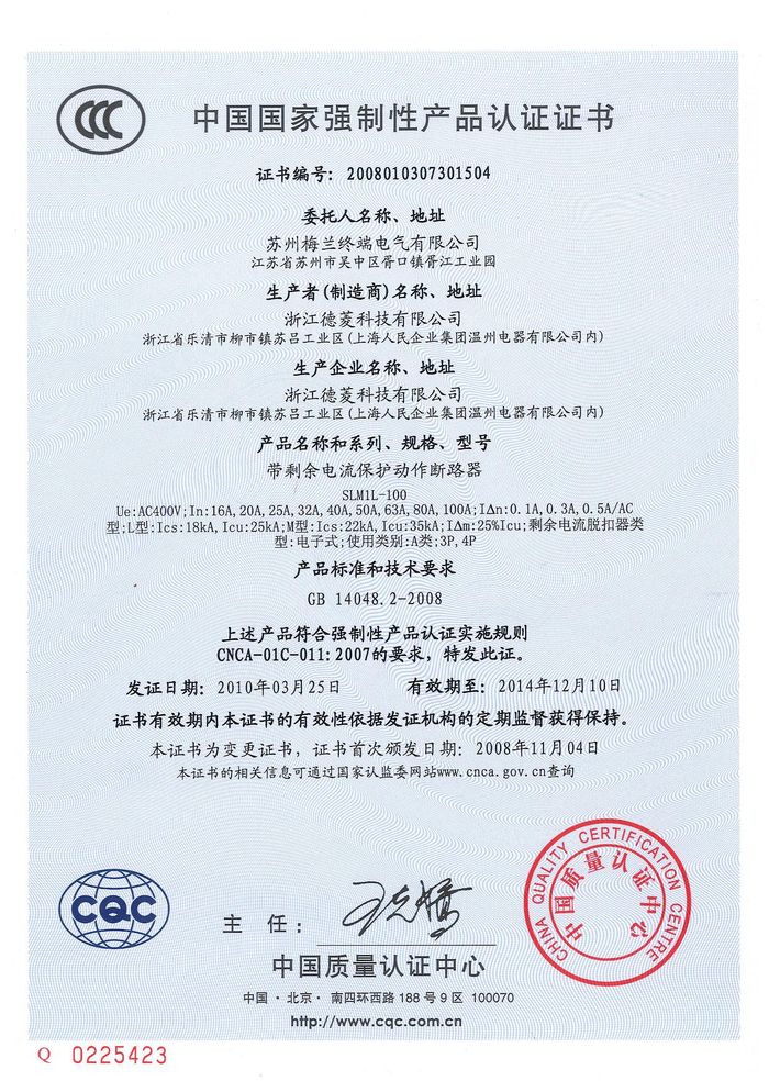 SLM1L-100塑殼斷路器資質(zhì)證書(shū)
