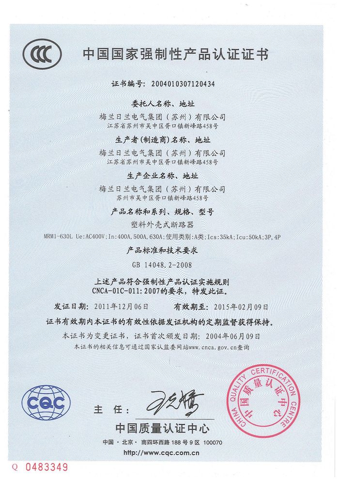 MRM1-630L塑殼短路器資質(zhì)證書(shū)