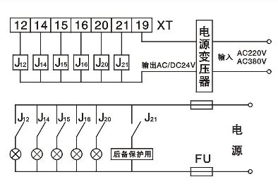 二次接線(xiàn)如圖所示[直流電源DC110V或220V從U1(+)、U2(-)輸入,直流電源模塊兩輸出端分別相應與二次接線(xiàn)